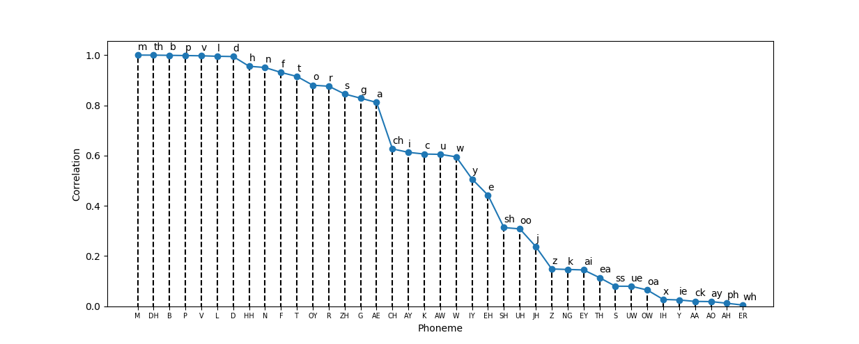 This sentence exemplifies the ambiguous pronunciation of the “ough” in the above words, such as by OW or AH F, which is evident to native speakers but a headache for non-native English learners. This type of ambiguity is a heterophone : same spelling, different pronunciation. For anyone studying English it is soon evident that the written symbols (graphemes) don’t always match the spoken sounds (phonemes). This grapheme-phoneme correspondence in the English language is low (turns out it was more phonemic in the past)… What if we can make it perfect?