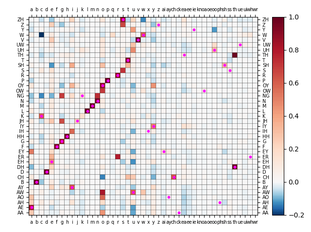 Alas, as we can see above, most of the digraphs are only weakly correlated with the phonemes, i.e. the single characters have stronger correlation. This may also be due to a relatively lower frequency of digraph usage in the words in general. On the other hand the digraph “th” conveniently filled the gap of high correlation for the phonemes TH and DH that a single letter couldn’t. In any case, now that we have more graphemes than phonemes it is in principle possible to uniquely assign a grapheme to each phoneme. The algorithm is as follows: