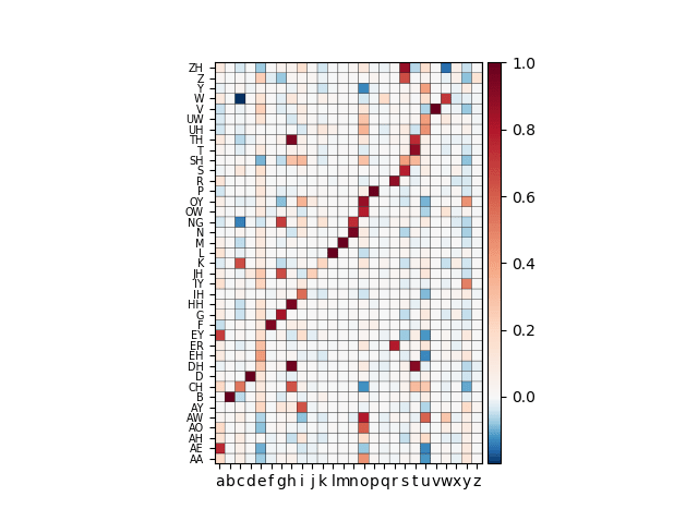 As it turns out the above transformation maps satisfies the relation perfectly. Unfortunately, it resulted in a somewhat nonsensical result implying that the phoneme AH can be represented equally well by any of the letters. Since the values are fractional it can be thought of as implying the likelihood of a letter given the phoneme. Hence, by this interpretation the transformation matrix can be thought of as a correlation matrix (this shift in perspective is necessary to understand negative values).