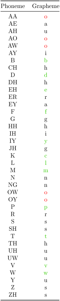 - The grapheme at the col index assigns it to the phoneme at the row index