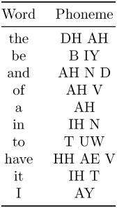 Lets start by getting a dictionary of words and their corresponding phoneme. This data for North American English is available from CMUdict (Carnegie Mellon University Pronouncing Dictionary) which contains over 134,000 words and their pronunciations. Since we do not want to bias the result by archaic or rarely used words (and their corresponding phonemes): only the top 5000 most frequently used words in the English language will be used in the following analysis. Then the top 10 will look like this: