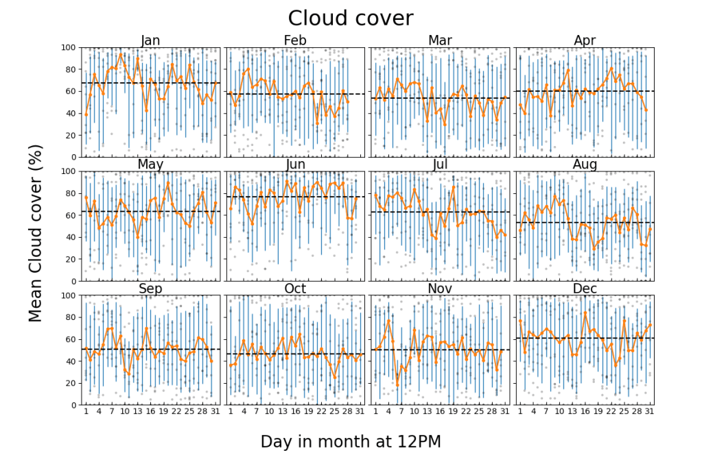 7. Calculate the bounds about the mean value (by taking the average of the values that are greater than the mean for the upper bound and lower than the mean for the lower bound). This approach was used rather than standard deviation since there are few data and data like cloud cover, which is bound between 0% and 100%, does not follow a Gaussian distribution.