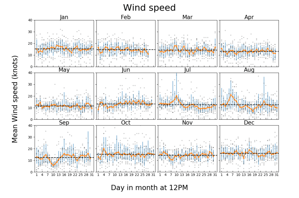 Using Python, I present the statistical mean values for the temperature, rain fall, wind speed, and cloud cover data in Okinawa for each day in each month of the year. Let’s see the results first!