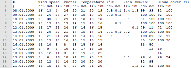 - Copy daily archive data for the given location from https://www.windguru.cz/archive.php