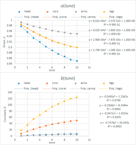 All tuned parameters have the same slope vs tune and constant vs tune functional relation as with weight. The slope and constant are as shown: