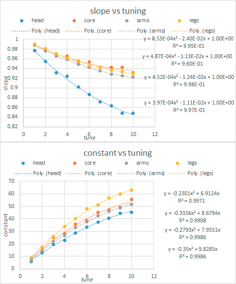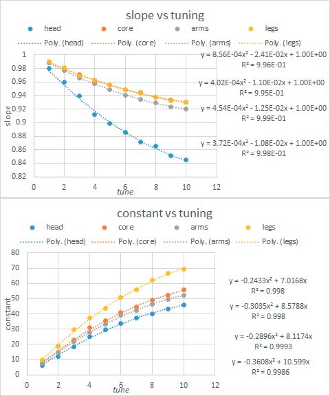 Again, using extensive data collection I figured out some relationships between the degree of tuning, an integer value between 0 and 10, and the effect it has on the stat: