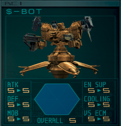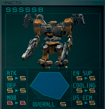 An AC build will have the following metrics: Attack, Defense, Mobility, Energy Supply, Cooling, and vs ECM, which will be ranked on a letter scale (E, D, C, B, A, S) in terms of performance given its numeric value. As an important side note: when I was putting parts together by hand, no matter what I did, I could not manage to get all characteristics to be at S!