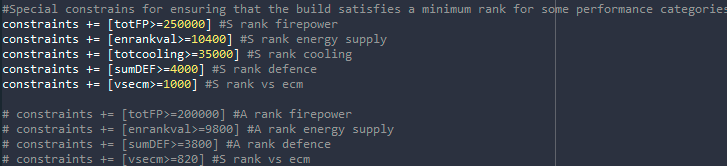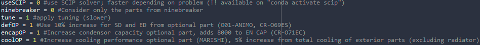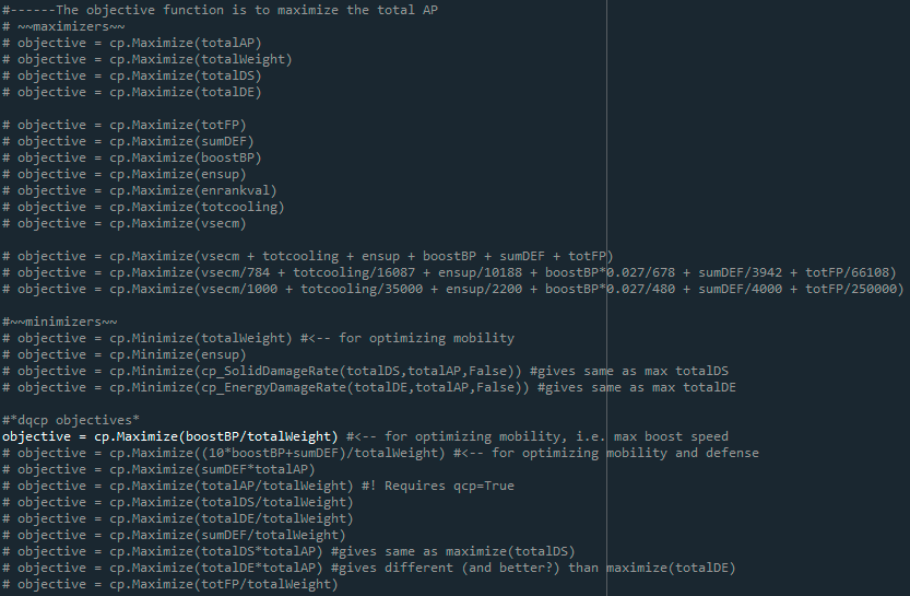 The script lets you choose the SCIP solver, which seems generally faster than the default but it needs to be installed. The script can exclude parts from AC:Last Raven if considering only AC:Ninebreaker. The “OP” variables enable/disable optional parts.
